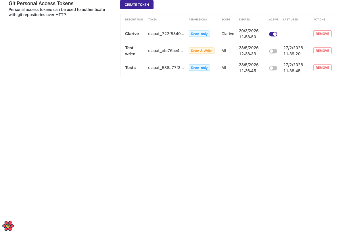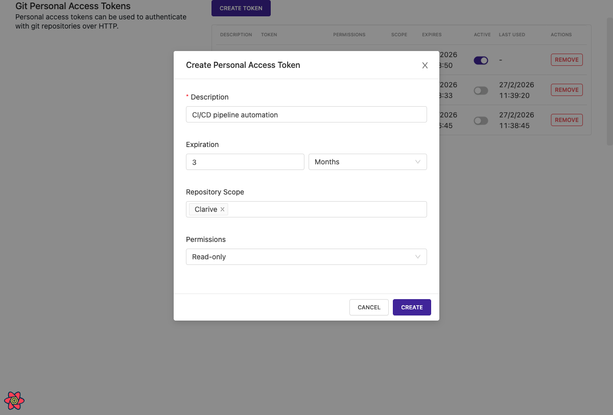 Personal Access Tokens (PATs) provide an alternative authentication method for accessing git repositories over HTTP. Unlike API keys, PATs can be scoped to specific repositories, set to read-only or read-write, and configured with expiration dates.